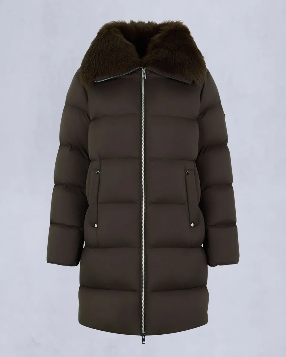 Die Belle Dune Long Shearling Puffer Jacke bietet maximalen Schutz und maximalen Stil. 90/10 Daunen, eine kuschelige Kapuze und eine lockere Silhouette, die bis zur Mitte des Oberschenkels reicht, sorgen für
