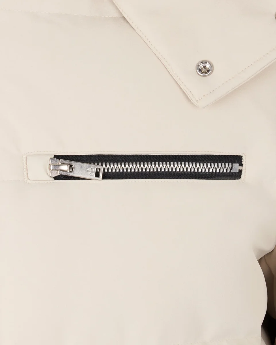 Entfernen Sie vor dem Reinigen der Jacke die abnehmbaren Verzierungen. Innenseite nach außen chemisch reinigen – schonendes Verfahren. Bügeln bei maximal 110 °C – ohne Dampf.